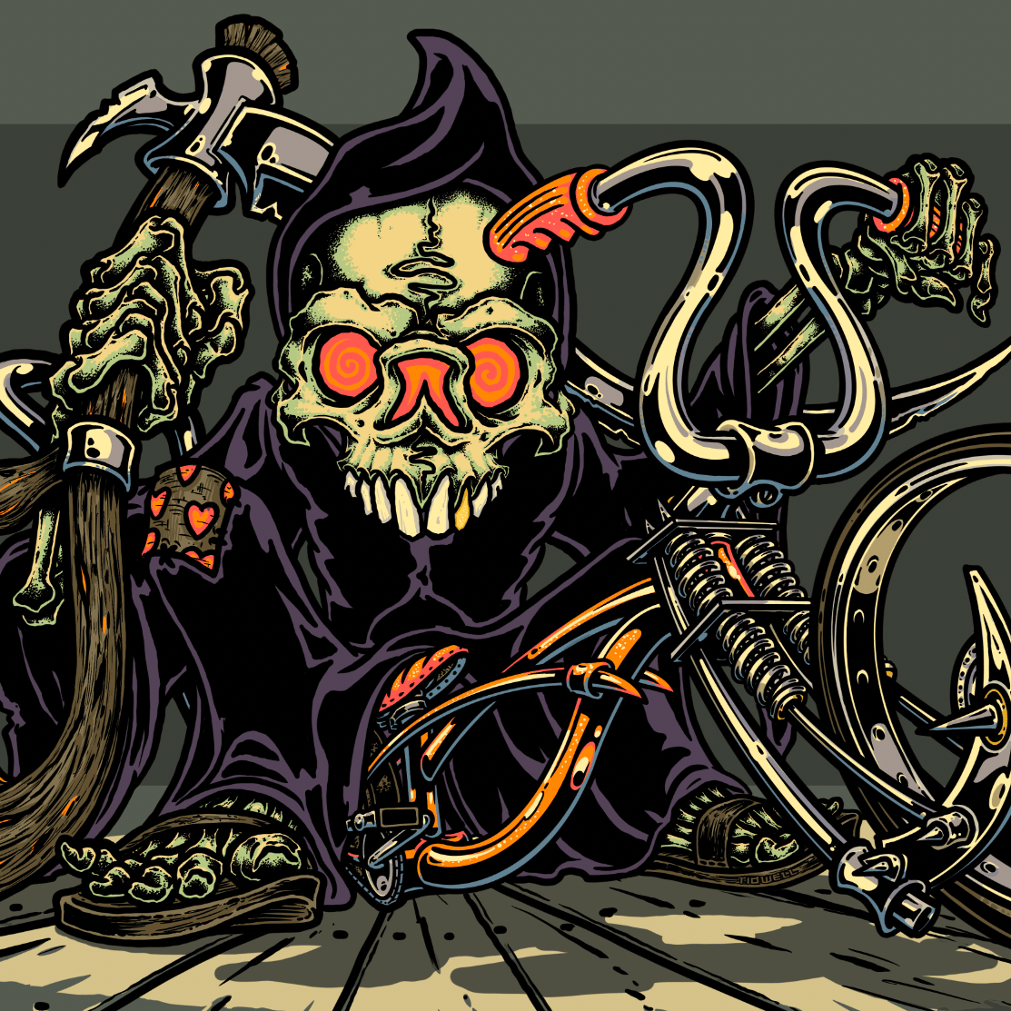 The grim reaper rides a badass lowrider bicycle and wants to take us all for a ride. 13x19 inches, heavy weight, acid free, lithograph print. Hand signed and shipped with a bunch of rad stickers.